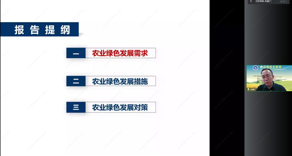为深入学习习近平生态文明思想,本次讲座以“农业绿色发展与生态文明建设”为主题,开启了南山经济大讲堂(第二讲)。仇焕广就讲座主题展开论述。他首先介绍了农业绿色发展的必要性、农业绿色发展和乡村环境治理在美丽中国建设中的重要作用。随后,结合二十大报告精神分析农业绿色发展、乡村环境治理的目标、既有政策措施及落地实效。最后,提出进一步完善的政策建议。在交流发言阶段,来自yl34511线路中心和长江上游经济研究中心的数名专家学者也就农业绿色发展主题发表了自己的建议与见解,为积极践行习近平生态文明思想建言献策。