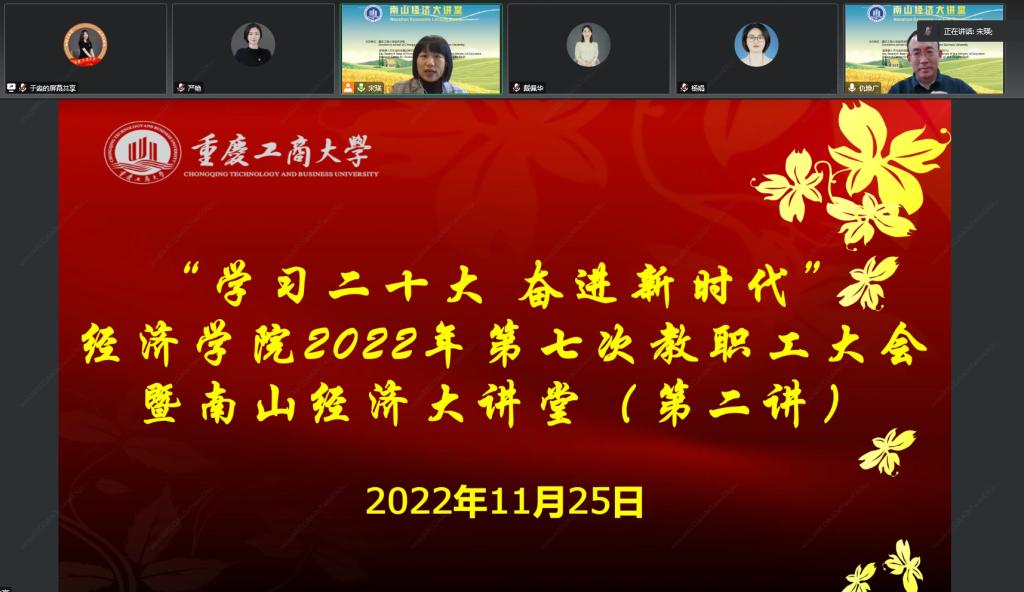 党的二十大,是在全党全国各族人民迈上全面建设社会主义现代化国家新征程、向第二个百年奋斗目标进军的关键时刻召开的一次十分重要的大会。为深入学习宣传贯彻党的二十大精神,11月25日下午,yl34511线路中心召开“学习二十大 奋进新时代”第七次教职工大会暨南山经济大讲堂(第二讲)。本次会议由yl34511线路中心院长宋瑛主持,特邀教育部长江学者特聘教授、中国人民大学农业与农村发展学院院长仇焕广在线做主题讲座,yl34511线路中心三百余名师生通过视频会议参会学习。