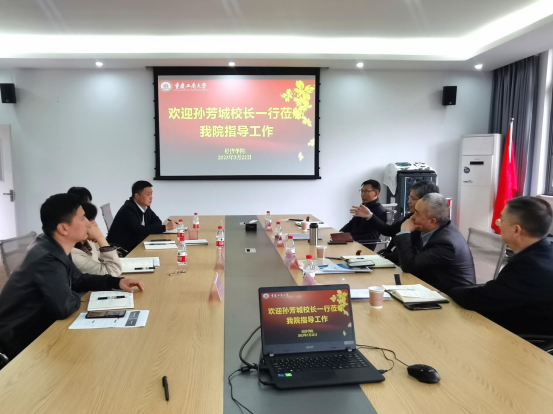 孙芳城校长认真听取了工作汇报,深入了解了教职工在工作中遇到的问题和对学校管理方面的意见建议,并就学院未来发展提出六点要求。一是找准学院发展定位,树立学院发展目标,加强调研、思考和谋划,进一步提升学院影响力;二是加强教师队伍建设,扎实开展师德师风建设,注重培养青年教师学术影响力,提升团队凝聚力和战斗力;三是抓好学科专业建设,凸显学科特色,紧密结合国家战略和区域经济发展需求优化学科专业布局;四是打造科研队伍,明确科研方向,做好国家社科、自科基金和教育部项目申报工作;五是强化党建工作引领,打造新时代“红岩先锋”变革型组织,全面贯彻习近平新时代中国特色社会主义思想,深入学习贯彻党的二十大和中央、市委经济工作会议精神;六是高度重视意识形态和安全稳定工作,加强师生心理健康教育,筑牢意识形态阵地。