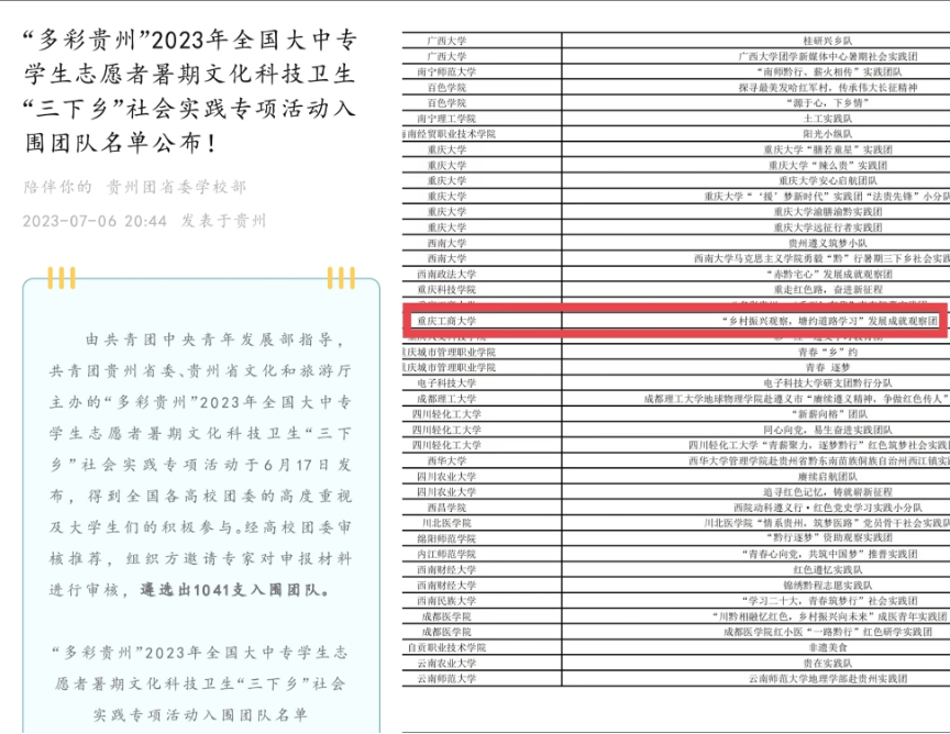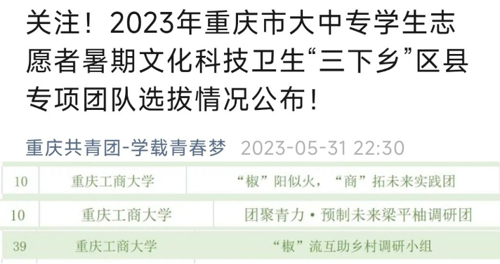 yl34511线路中心“乡村振兴观察,塘约道路学习”发展成就观察团入围“多彩贵州”2023年全国大中专学生志愿者暑期文化科技卫生“三下乡”社会实践专项团队yl34511线路中心“‘椒’阳似火,‘商’拓未来实践团”、“团聚青力·预制未来梁平柚调研团”和“‘椒’流互动乡村调研小组”三支队伍成功入选重庆市志愿者暑期文化科技卫生“三下乡”区县专项团队。
