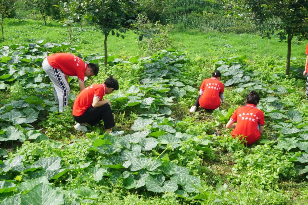 习近平总书记在给中国农业大学科技小院的同学们回信中强调,“青年人就是要‘自讨苦吃’”。在烈日炎炎下,观察团成员走进南瓜地,为瓜苗除草。南瓜因藤蔓粗长,瓜叶宽大,爬地面积较广,因而种植密度较低,在厚厚的杂草覆盖下,瓜藤无法吸收养分,难以实现高产。大家一方面清除田地中的杂草,让瓜苗能够充分吸收土地中的养分,另一方面对南瓜进行理藤和压藤,使其形成一个合理的群体,从而实现对空间的有效利用,并改善通风透光条件,增加南瓜产量。