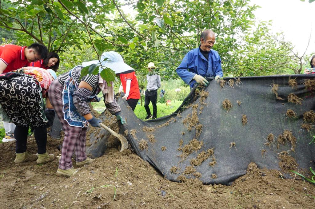 (观察团成员协助农户为柿子树下种植的竹荪除草)