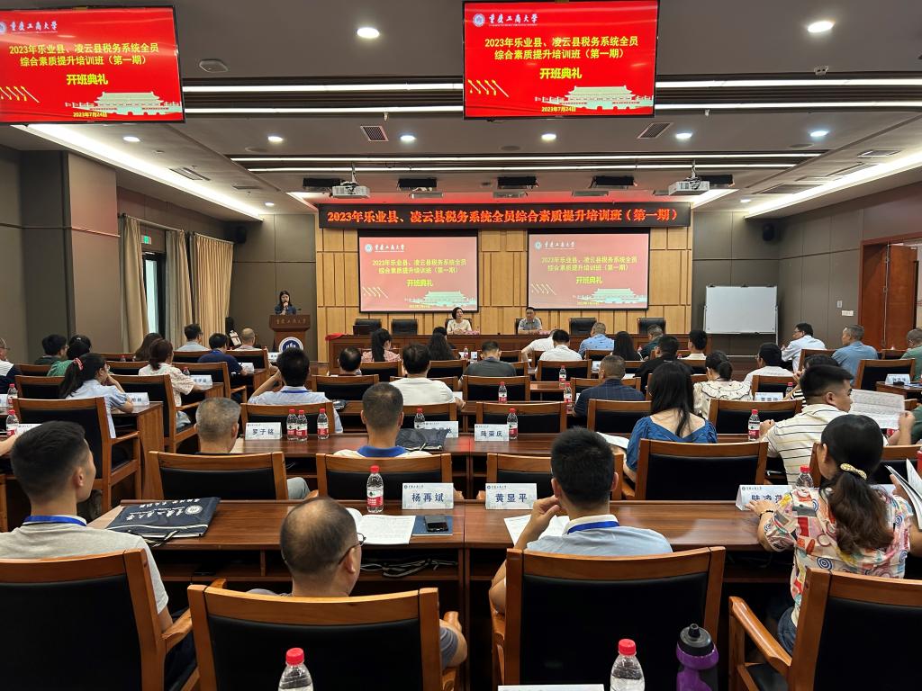 2023年7月24日上午,2023年乐业县、凌云县税务系统全员综合素质提升培训班(第一期)开班典礼在yl官网图书馆会议中心一会议室举行。乐业县、凌云县税务系统共计80名业务骨干参加此次培训,重庆工商大学yl34511线路中心综合办公室主任严艳,乐业县税务局党委书记、局长廖宾出席开班仪式。