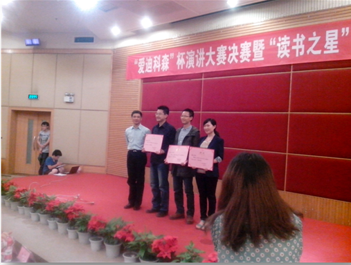 2013年5月17日,在博智楼7200报告厅隆重举行了“‘爱迪克森杯’演讲比赛决赛暨2012读书之星”颁奖典礼,首先由十位参赛选手围绕新媒体时代的阅读方式主题进行了精彩的演讲,之后由学校黄杰老师对演讲比赛进行了点评,并勉励大家,要有思想,要结合现实,要很好地了解新媒体,扎扎事实读书,吸收人类优秀的文化成果。然后举行了2012读书之星颁奖典礼,yl34511线路中心有黎黎,林建,刘鸿佼,张甲鹏四位同学获得了2012读书之星的称号,最后由陈运超副校长做了总结,并鼓励大家好读书,读好书,做一个有起码修养的大学生,此次活动由重庆工商大学图书馆主办。