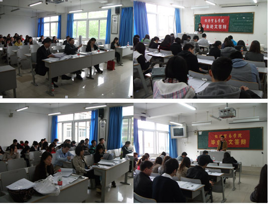 2012年4月14日全天,经贸学院在博智楼4楼举行了2012届本科毕业论文答辩。参加本次论文答辩共有2012届本科生401人,涉及经济学、贸易经济、国际经济与贸易、会展经济与管理四个专业。根据学生的选题,学院将所有答辩学生分为13小组,每组25到33人不等。