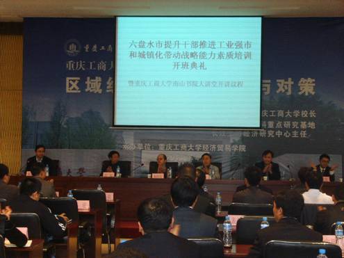 “六盘水市提升干部推进工业强市和城镇化带动战略能力素质培训班”于2011年4月12在重庆工商大学开班。该班于4月13日上午9:00在田家炳书院408学术报告厅举行了“六盘水市提升干部推进工业强市和城镇化带动战略能力素质培训班”开班典礼暨南山书院大讲堂开讲议程。出席开班典礼的有重庆工商大学校长杨继瑞教授,科研处处长余兴厚教授、南山书院总经理刘洪毅、经贸学院院长陈新力教授、六盘水市委党校副校长马秀峰以及123名六盘水学员。