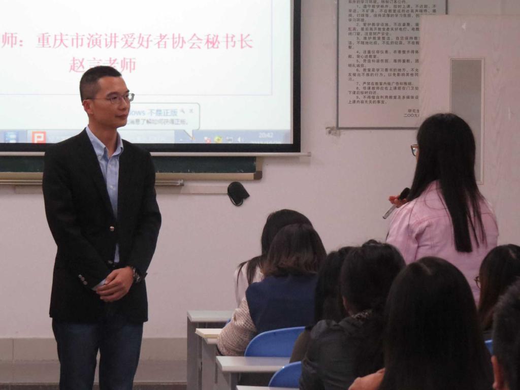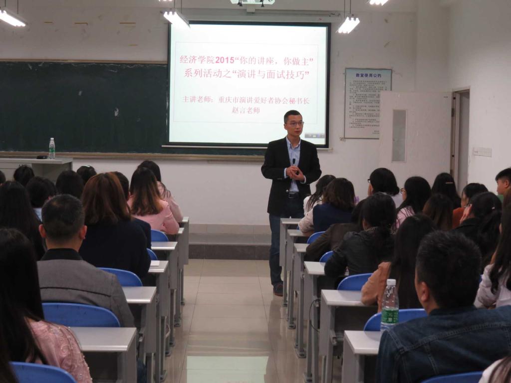 10月29日晚,yl34511线路中心2015“你的讲座,你做主”系列活动之演讲与面试技巧专题讲座于田家炳书院50306举行,重庆市演讲爱好者协会秘书长赵言老师作为主讲老师莅临本次活动。活动吸引yl官网学子积极参加,全场座无虚席,气氛热烈。yl官网国资处副处长、yl官网原党总支副书记雷菁作为嘉宾出席了本次活动,她表示,yl官网2015“你的讲座,你做主”系列活动是在同学们的建议下,为激发大家的学习兴趣而开展的系列主题讲座活动,主要有演讲与面试技巧、PPT制作、红酒品鉴等内容。