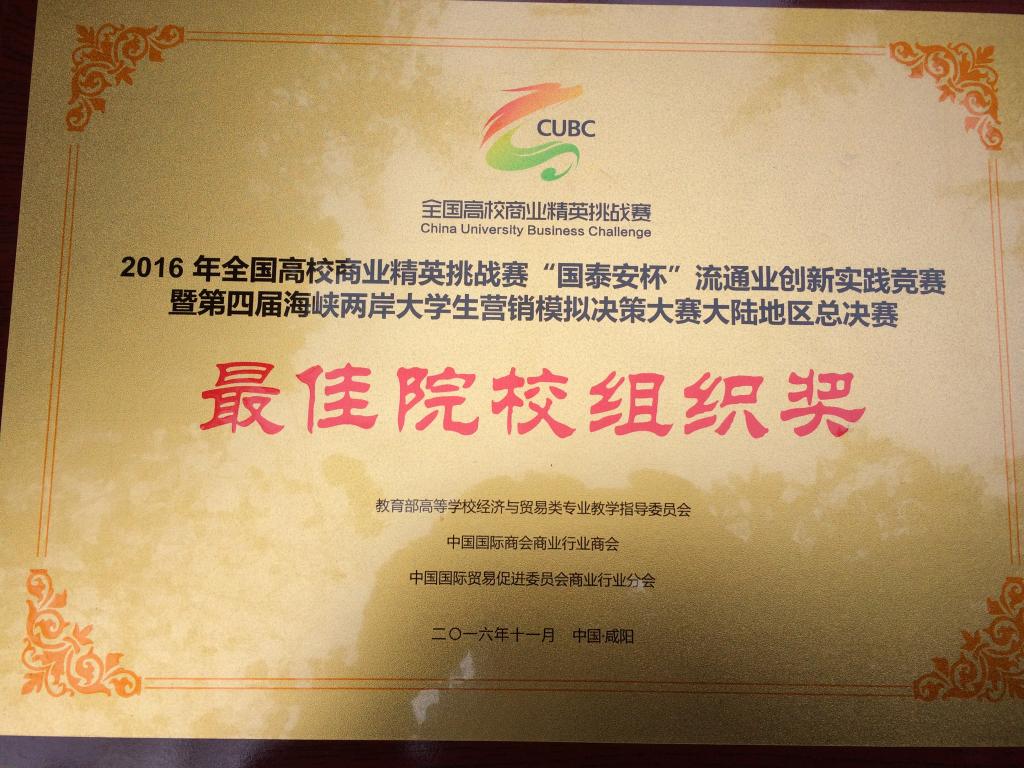 日前,由教育部经济与贸易类专业教学指导委员会、中国国际贸易促进委员会商业行业分会、中国国际商会商业行业会和深圳国泰安教育技术股份有限公司联合主办的2016全国高校商业精英挑战赛“国泰安杯”流通业创新实践竞赛大陆地区总决赛成绩在咸阳揭晓,由yl官网杨海丽、喻智成、刘瑜、张弛、沈红兵5位老师指导的6支队伍,分别获得一等奖(2支队伍)、二等奖(2支队伍)、三等奖(2支队伍),同时5位老师也分别获得“优秀教师指导奖”。