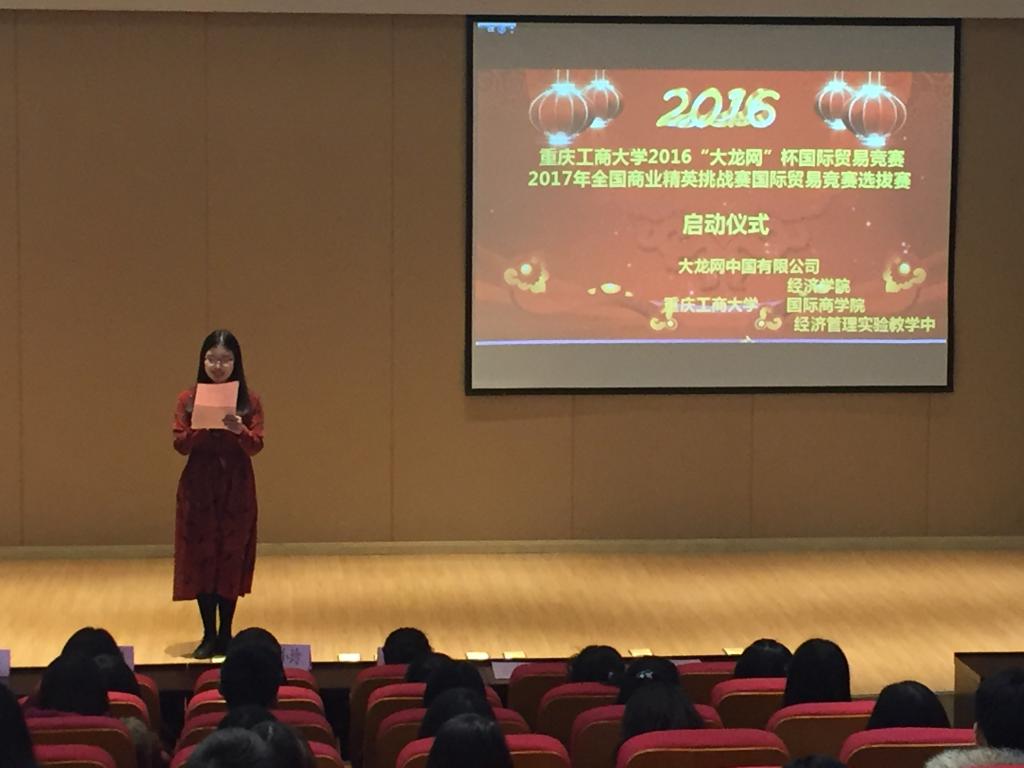 2016年12月30日下午,yl官网2016“大龙网”杯国际贸易竞赛暨2017年全国商业精英挑战赛国际贸易竞赛选拔赛启动仪式在田家炳书院50209报告厅隆重举行。yl34511线路中心分党委王小玲书记,大龙网中国有限公司副总裁、大龙学院执行院长高海鹰女士,yl34511线路中心副院长宋瑛副教授,yl34511线路中心分党委于频副书记,yl34511线路中心国际经济与贸易系主任尹元福副教授,国际商学院学生部部长苟焰老师,国际贸易竞赛教师指导团队和各学院参加此次校内竞赛的所有同学参加了本次启动仪式。