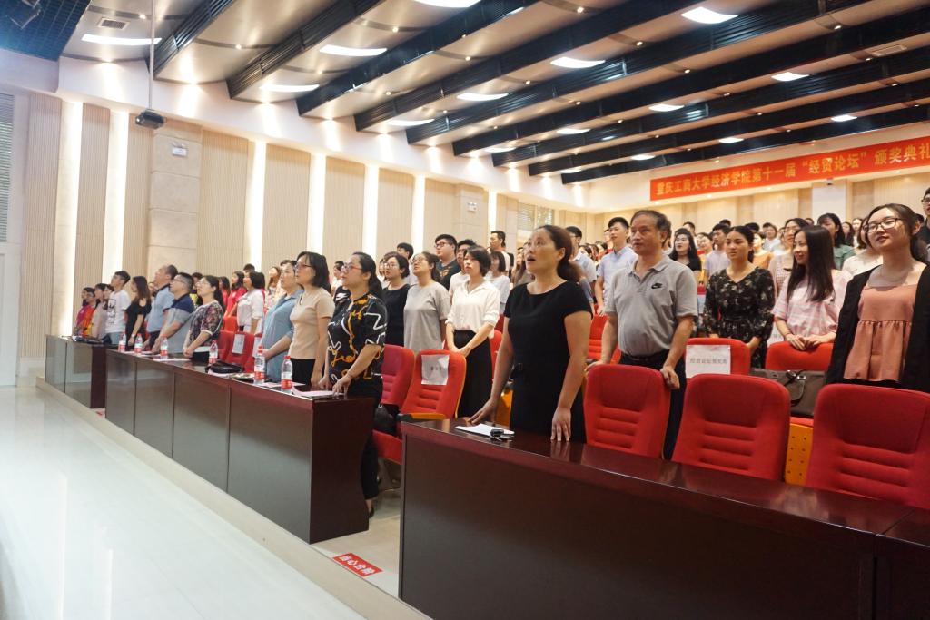 本次大会在庄严的校歌合唱声中开始。活动共分为四个环节,包括第十一届“经贸论坛”颁奖;学风建设工作表彰;活力团支部;优秀国防班会以及36182素质拓展颁奖和国贸技能大赛发布会展示。首先,王小玲书记为本次颁奖典礼致辞,希望同学们可以将理论和实践相结合,不断的加强学术能力的培养。随后,由院长助理黄潇老师宣读了本届“经贸论坛”的获奖名单。学生代表任培艺同学分享自己的获奖经验,表示在学术论文选题、撰写等方面,要多和老师、同学加强沟通交流,不断的完善文章思路,同时感谢学院有这样一个平台,可以让同学们的论文写作水平得到锻炼。