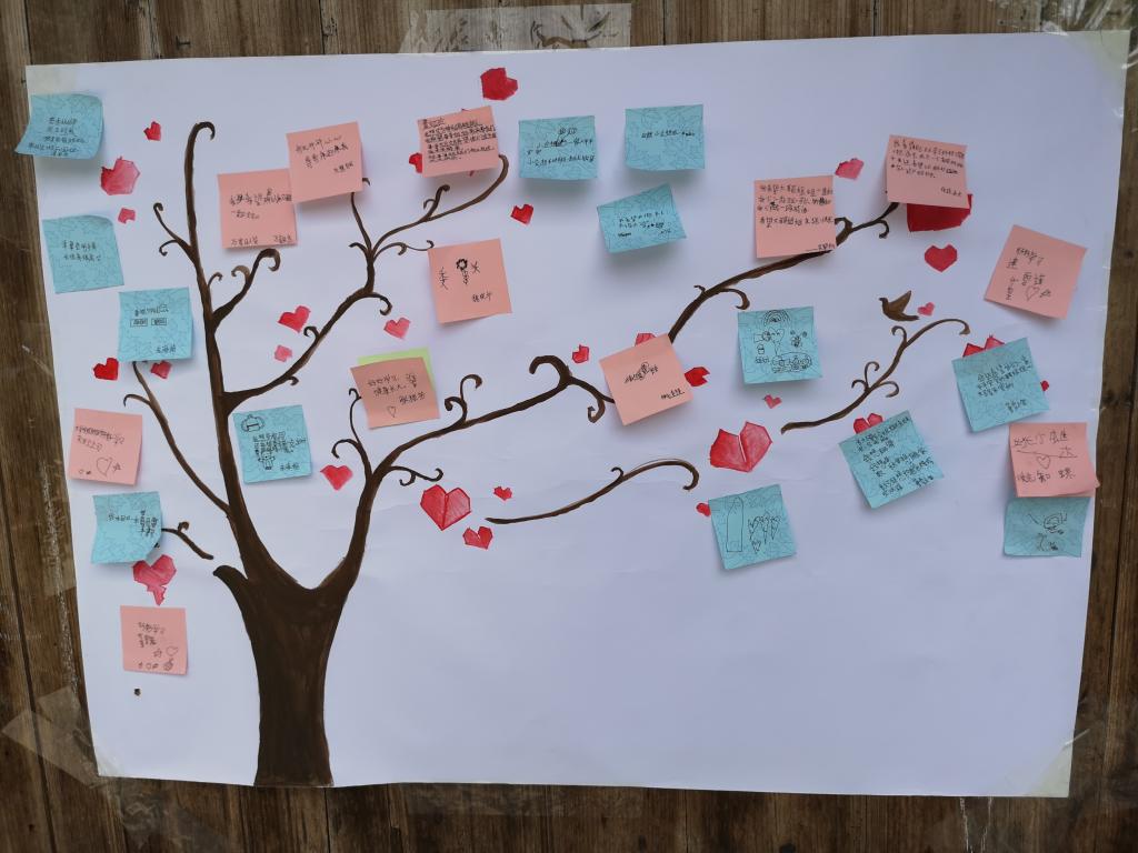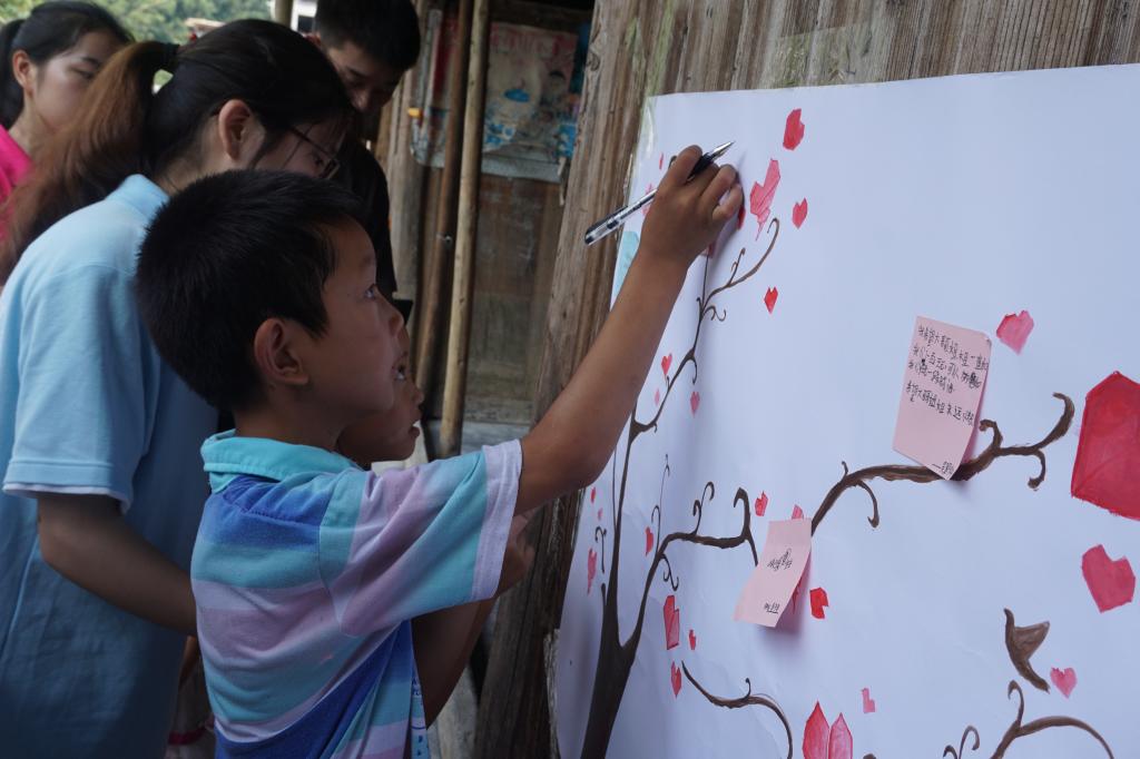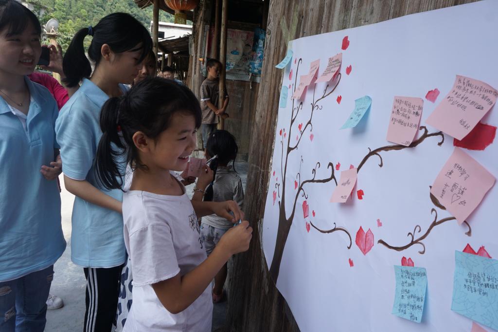 为了更好地帮助这些孩子,重庆工商大学yl34511线路中心定期给这里的孩子寄出爱心包裹。今年暑假,yl34511线路中心实践队成员们再次来到营盘村小学,开展了为期一周的教育关爱活动,其中为了更好地开展爱心包裹项目、了解孩子们的需求,实践队员们特地准备了“心愿树”活动。活动伊始,孩子们安静地坐在座位上,等待实践队员们为大家分发笔和纸。孩子们拿到笔后,实践队员在一旁耐心地与孩子们沟通,逐步引导孩子讲出自己的心愿,孩子们低头认真地在纸上写着自己的愿望。写好自己的心愿后,孩子们小心翼翼地将心愿纸贴到心愿树上,两只小手用力地将它粘在上面,期盼着他们的愿望能够早日实现。