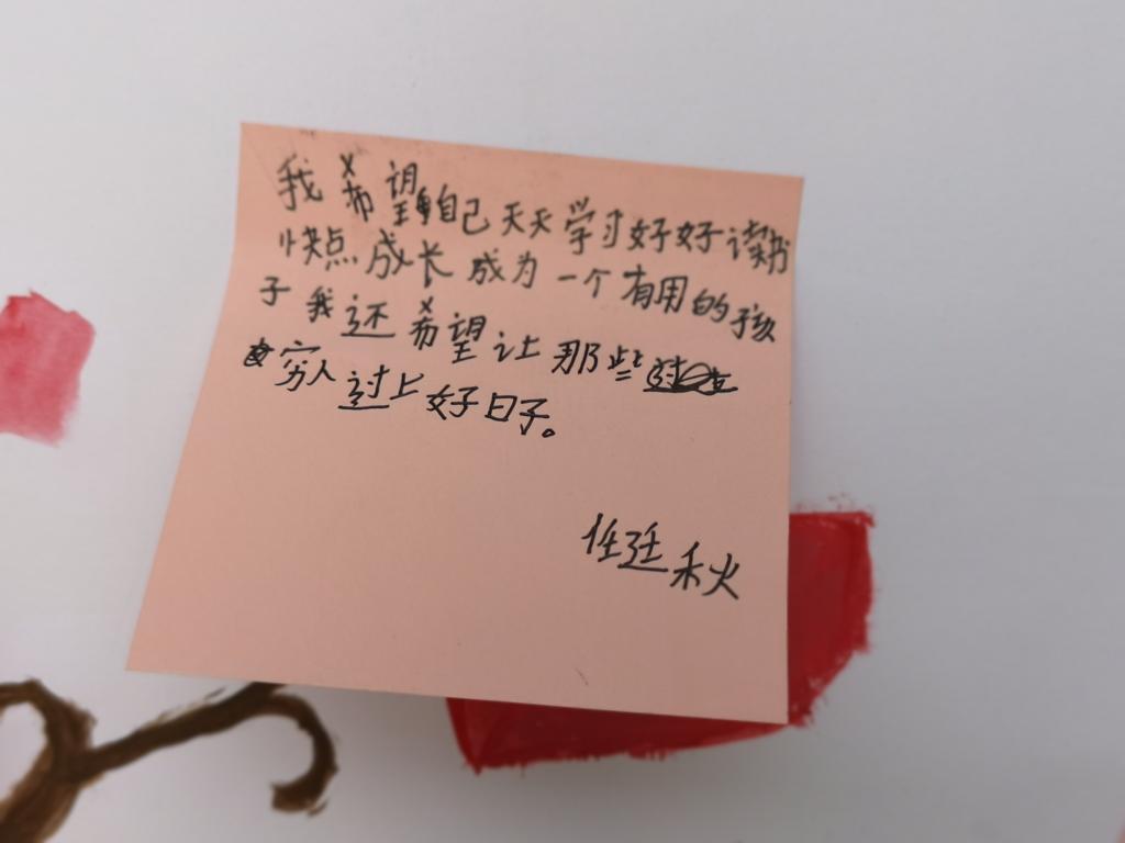 实践队员们通过心愿树以及和学校老师交流的方式,旨在了解孩子们的内心需求,根据这些心愿分清近期需要与远期需要,进行合理评估,为孩子们送去关爱,让“爱心包裹”圆孩子们的心中寄托。