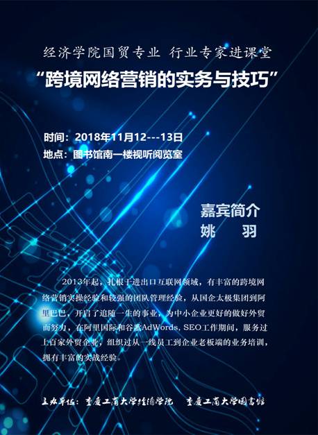 2018年11月12日-13日下午,由yl34511线路中心和图书馆主办,yl34511线路中心国际经济与贸易系承办的国贸专业“行业精英进课堂”活动在图书馆一楼视听阅览室举行。该活动是yl34511线路中心为“推动人才培养模式改革,促进政产学研深度合作”打造的精品课堂,自推出以来,获得学院师生的好评。本次活动邀请了跨境电商行业精英姚羽老师,图书馆戴林副馆长,国贸、贸经等专业160余名同学参加了此次活动。