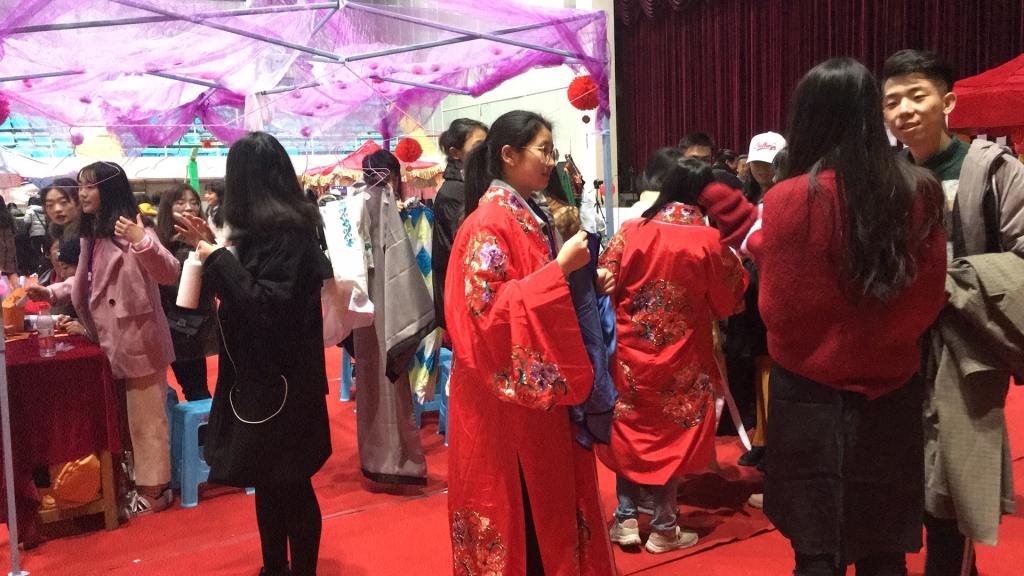 本次文化节,不仅有台上的精彩节目,同时台下还设置了丰富多彩的游戏环节。整个活动会场主要分为八个场区,分别是:文场笔苑、大医精诚、妙趣横生、锦罗玉衣、转轴拨弦、青釉繁花、渝州钱庄、诗说心语。除此之外还有你画我猜、病急投医 、七上八下、锦衣华服、闻歌起舞、千古寻瓷等精心设置的传统有趣小游戏。让同学们在游戏中领略经典文化的魅力,增强文化素养。精美的布置,仿佛让人们身临其境,穿越回了古代,还有与之相随的游戏环节,更加让参与人员体验到了经典之美,文化之趣,文化自信油然而生。每个游戏不仅是体力的考验更是对同学们传统文化知识的检验,结合历史考验智商,这些游戏不但能够让人品味经典,也让人不得不惊叹古人的智慧。每一个活动的环节都有专业的讲解人员,在他的详细讲解之后,大家都能对与之对应的经典有了一定的了解,激发了大家的兴趣,一次次游戏体验不仅满足了大家的好奇心更是增加了大家的文化素养。