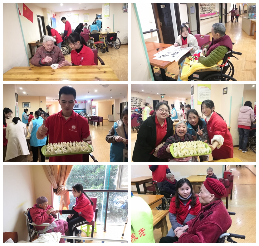 14点30分,经济学子们帮助刚午休完毕的老人们起床、穿衣、带老人们在房间里走动,活动身体。随后,一部分同学陪同老人们的同时,另一部分同学开始为老人们包饺子,煮饺子。在养老院工作人员的介绍和帮助下,同学们都尽量根据老人们的喜好和身体状况进行服务,有的为老人按摩;有的陪老人下棋;有的陪老人唱歌;有的听老人唠家常……。饺子煮好后,yl34511线路中心的同学们便为老人们盛好饺子并喂老人们吃。yl34511线路中心党员服务站成员热情洋溢,对老人们关心体贴,老人们脸上也都洋溢着幸福的微笑,同学们也满心欢喜。16点30分,此次聚福岛养老院志愿服务活动圆满结束。