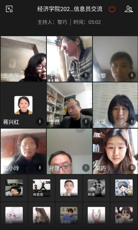 会上,各班信息员依次视频发言,汇报了学生在线学习的真实感受与意见。根据反馈结果,同学们对在线教学采取的“企业微信直播+在线综合学习平台”的方式总体满意,认为平台稳定,使用方便,教学方式新颖有趣,学习效果良好。其中,在线教育综合平台上的课程作业和课堂讨论方便同学们学习与交流,供同学们预习和复习的资源也较为丰富,更方便老师在线答疑;企业微信直播的效果好于其他直播平台,直播授课有多种备课方案应对突发情况,并且从上课效果而言直播课程比语音会议、视频会议好,同学们可以通过弹幕、音频参与,互动性强。在教师在线教学质量方面,学生认为大部分教师在线课堂亮点纷呈、互动性高,教学效果基本达到现场教学水平。学生给予老师们普遍好评,例如陈纪平老师讲课重点突出,注重同学的思维培训,逻辑分明;王希晨老师注重教学氛围,课堂互动效果好,课堂氛围活跃;王静老师课程节奏控制得当,时间观念强等。
