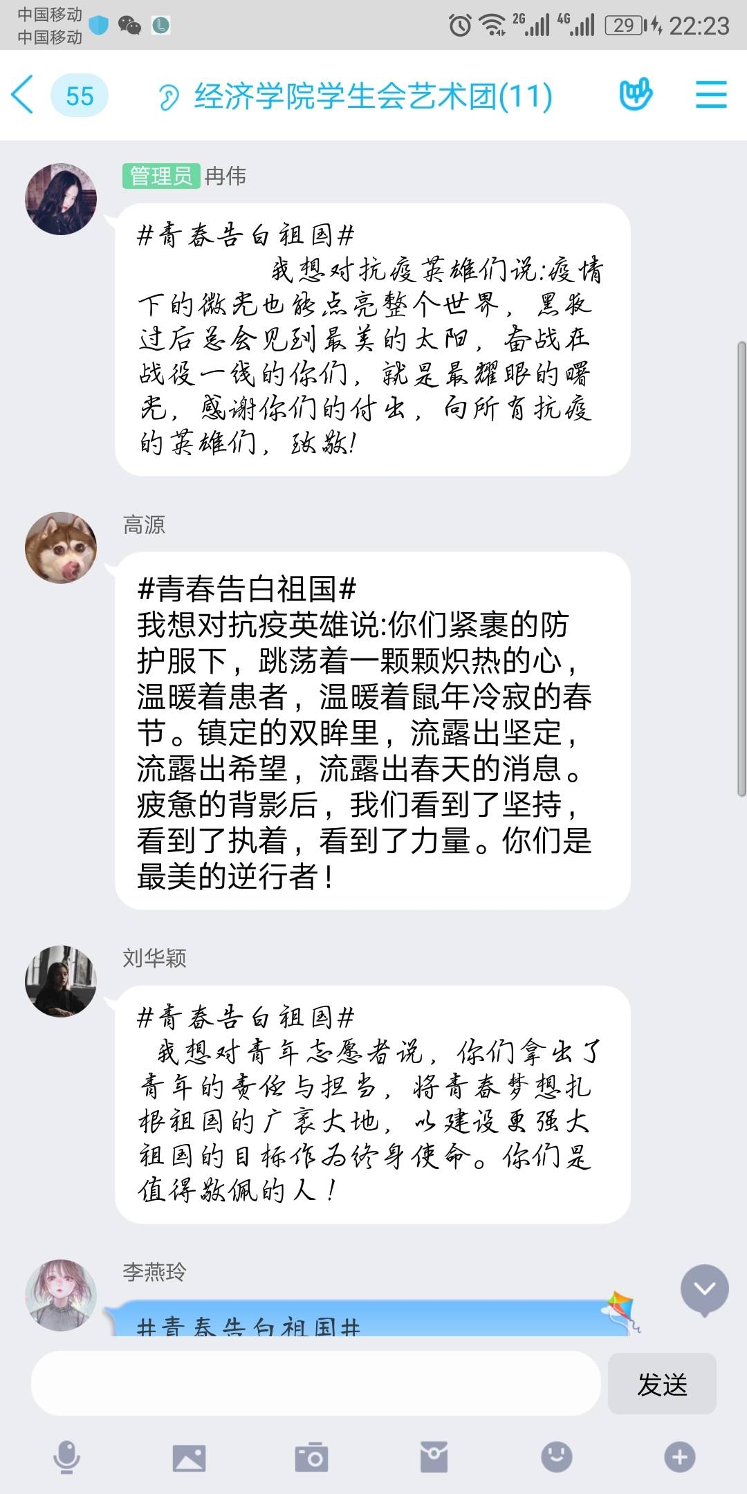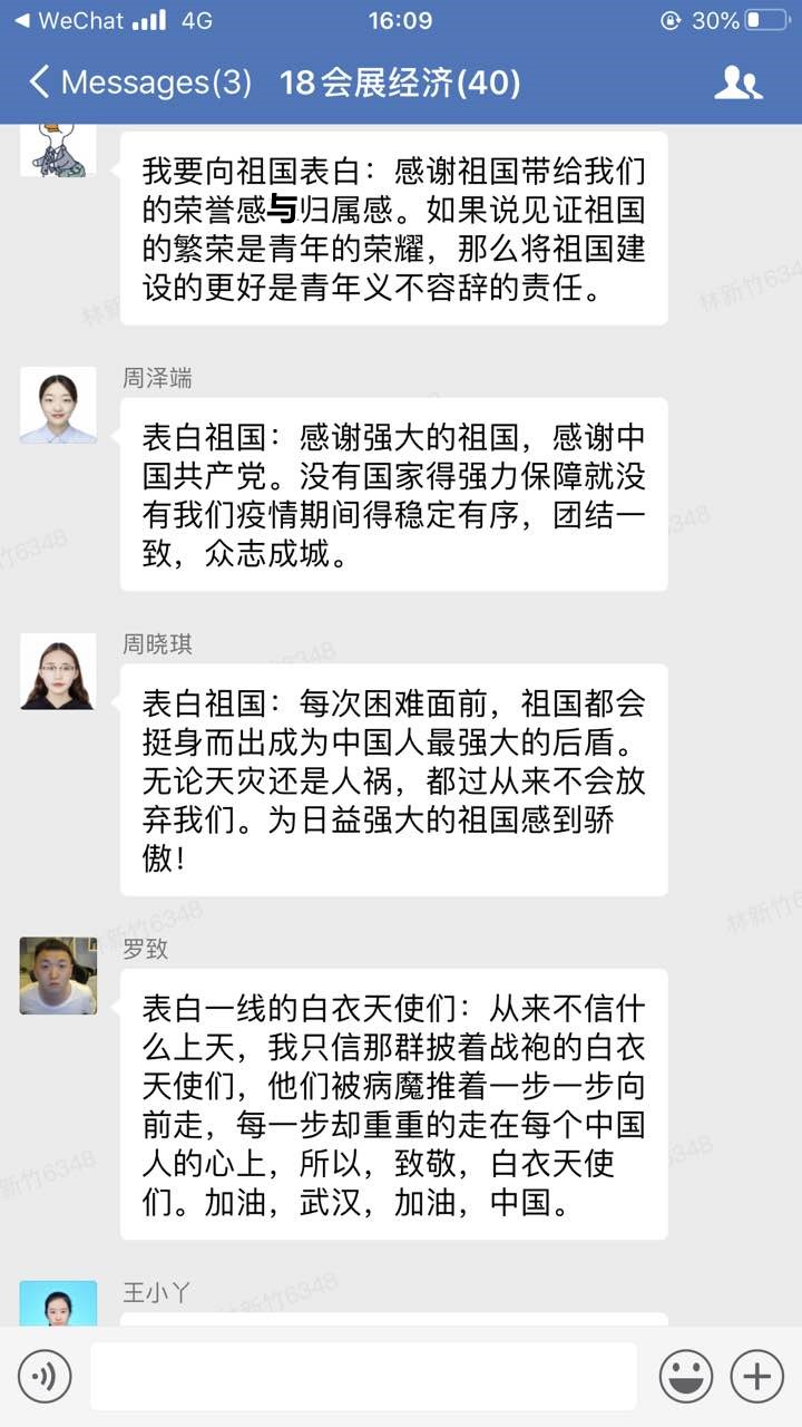 “青春告白祖国,我想对祖国说:何其有幸,生为中华儿女。天灾人祸,有你在便得安心。神州大地团结一心,愿我国早日恢复,繁荣昌盛。”在这个特殊五四青年节,大学生团员们虽然暂时不能返回校园,但激情与活力未减。yl34511线路中心分团委积极响应校团委号召,举办以“学习五四精神,青春告白祖国”为主题的活动,组织团员们学习习总书记五四讲话精神,并运用企业微信、QQ等各种线上平台的交流群,组织团员们以青春之我,告白祖国、告白共青团、告白奋斗中的广大中国青年,字里行间都流露出团员青年最真挚的感情。