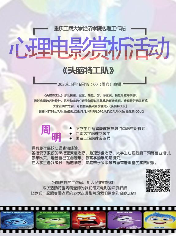 首先,由主持人在企业微信活动群发起直播, 19:00活动正式开始。主持人强调了此次活动的目的、重要性及意义后,向同学们介绍了活动的特别来宾——心理中心周明老师。接着,按照活动流程,大家一同观看了电影《头脑特工队》的精彩片段,然后主持人在积极申请发言的同学们中邀请了五位同学从不同角度同大家分享他们对电影的独特见解和感悟,从大家的分享中可知,这部电影让大家都对情绪都有了新的认识和体会。然后,邀请到了学校心理中心的周明老师对电影进行深度解析:周明老师首先肯定了工作站电影赏析的选材,也赞赏同学们的见解到位,将电影传递的信息和信念理解深刻,然后从两个方面为大家分析了心理学的知识,第一就是我们要正视自己的情绪,特别是负面情绪;第二是情绪需要表达,表达是有力量和意义的,拥有多彩的情绪才会成长;最后,老师用电影字幕“谨以此片献给我们的孩子请永远不要长大,那五彩斑斓的童年确是我们不该遗忘的港湾”结束了讲话。