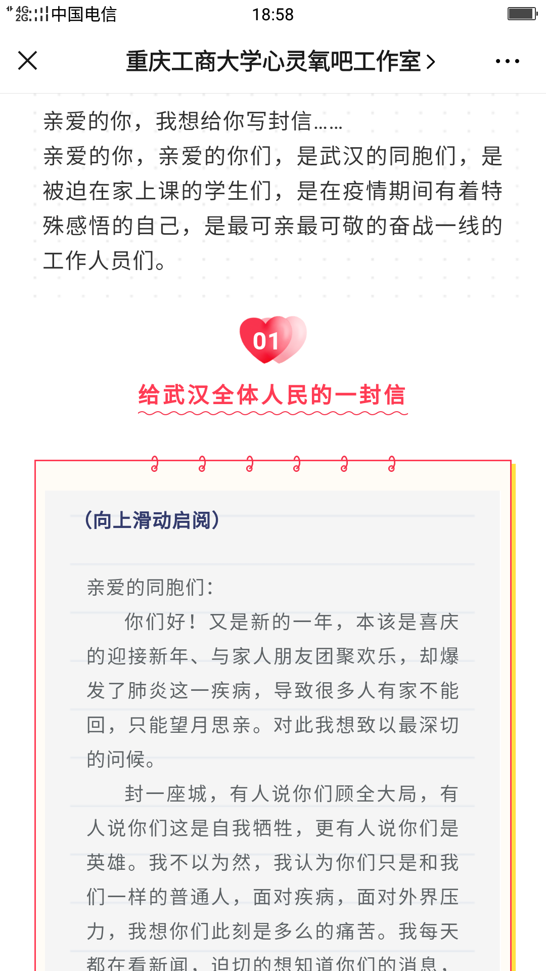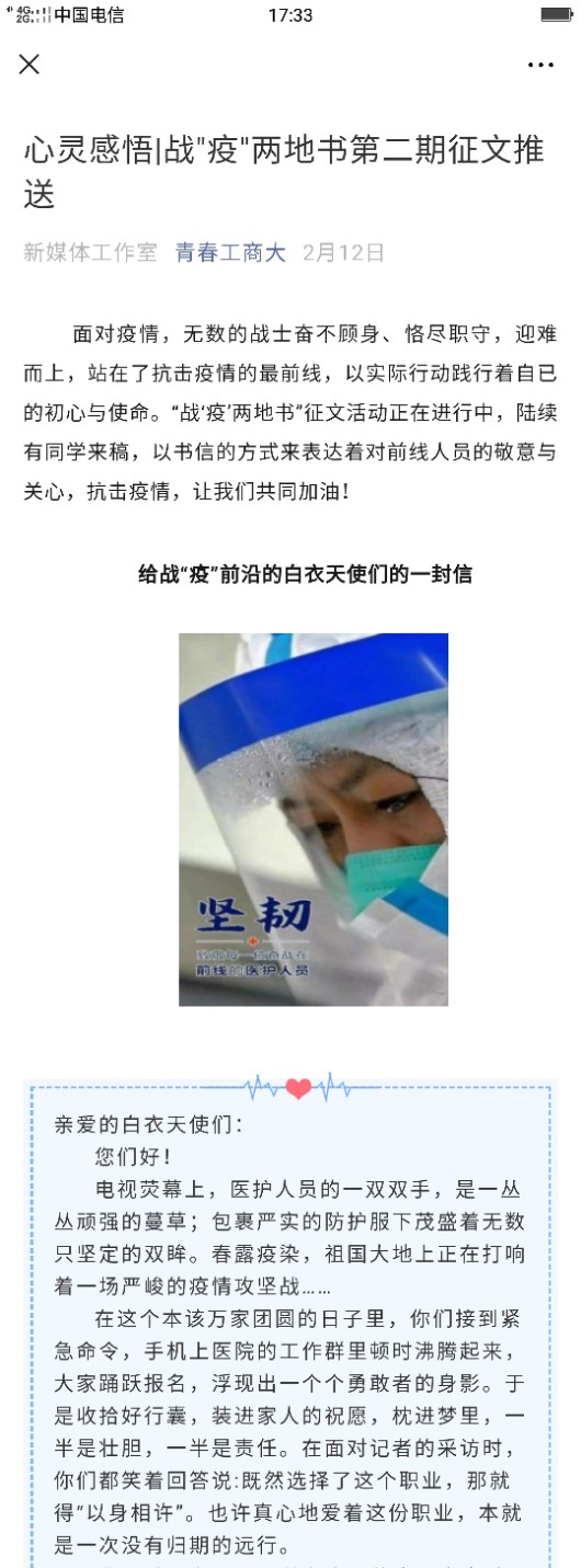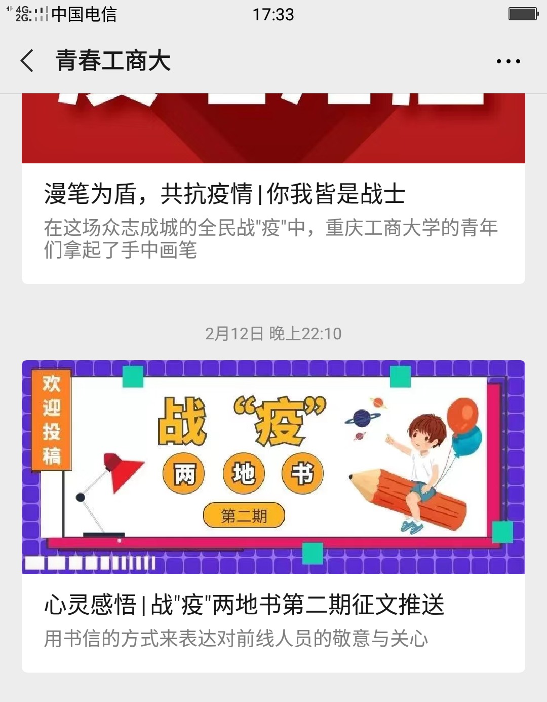 《给“白衣战士”的一封信》、《给钟南山院士的一封信》、《给武汉同胞们的一封信》、《给新冠病毒的一封信》......这一封封的信件寄托着重庆工商大学学生的敬佩、关心、希冀、牵挂,让艰难的日子充满温情,让战“疫”充满必胜的信心。