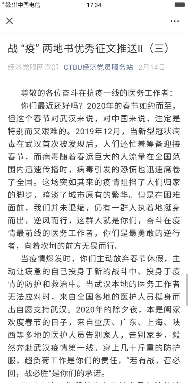 自新冠疫情发生以来,学校学工部、校团委、yl34511线路中心联合主办“战‘疫’两地书”活动,以“给......的一封信”的书信形式,征集原创、尚未公开发表征文,给奋斗在一线的广大医护人员、基层干部或湖北、武汉的同学们送去温暖与正能量。