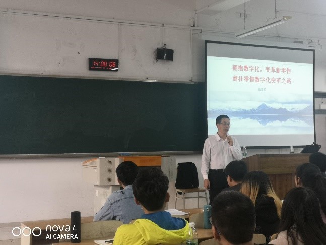 2020年11月10日下午2点,2019级贸易经济专业“零售学”课程“行业精英进课堂”教学活动在博智楼208教室举行,153人的阶梯教室几乎座无虚席。本次活动由教务处副处长宋瑛副教授主持,邀请yl官网国家级经济学实践教学基地重庆商社(集团)人力资源部张泽军部长作该课程教学内容之一的《拥抱数字化变革新零售——商社数字化之路》的教学授课。