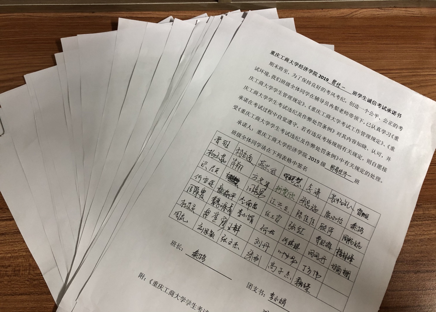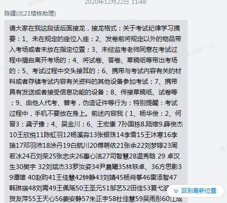 会上,王书记首先对《关于2020-2021学年第一学期期末教学运行安排调整的通知》做了解读和相关工作安排,特别强调了由于本学期期末考试是在原考试计划发生调整,要密切关注学生思想动态,提醒同学们认真复习按时参加各项考试。随后强调了期末安全稳定相关事宜,要求各班加强疫情防控,严格考试前请假制度。就冬季宿舍防火防盗、考风考纪教育和学生离校返家行程管理等问题进行了一一部署。各班级辅导员通报了诚信教育主题班会召开情况,全院全体学生线上线下、分散集中等多种方式学习了《重庆工商大学考试违纪及作弊处罚规定》,并承诺一定认真准备,诚信考试。