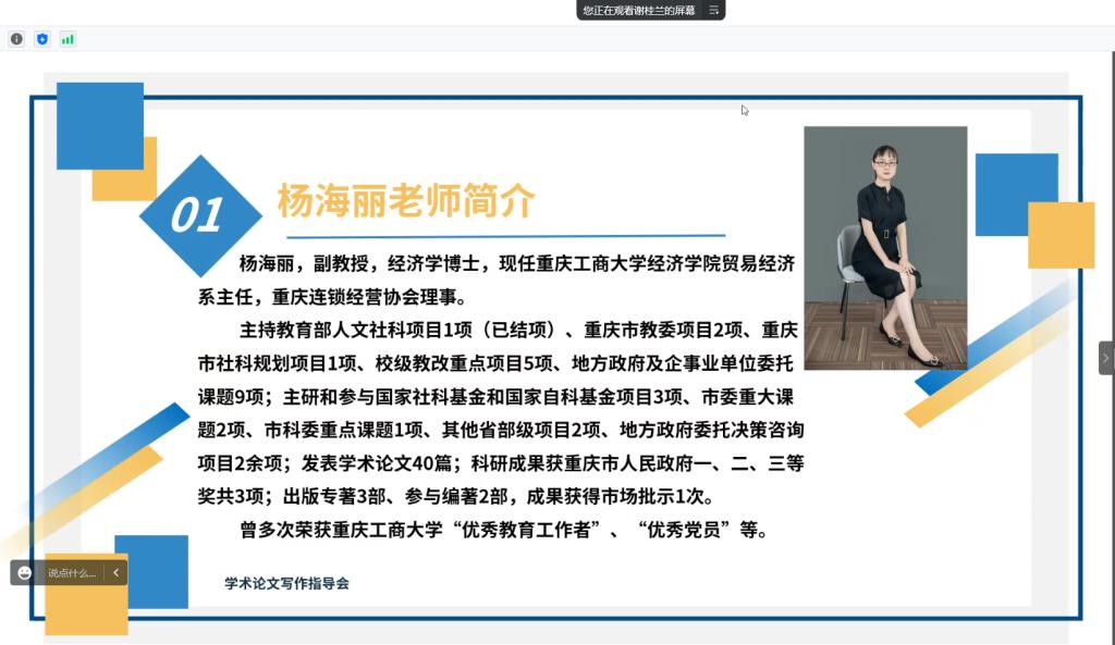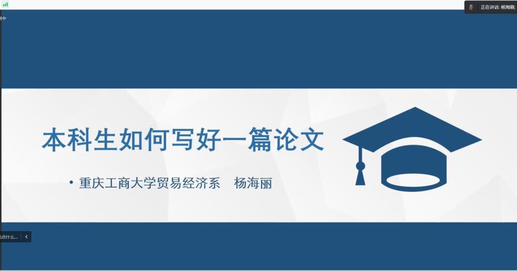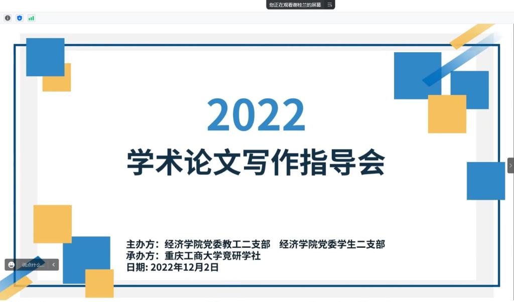 为使同学们更好地进行学术论文写作,进一步增强学术素养,2022年12月2日,由yl34511线路中心党委教工二支部和学生二支部共同主办,贸易经济竞研学社承办的线上学生学术论文写作指导会如期举行。此次指导会由教工二支部书记杨海丽老师主讲,学生二支部书记喻智成老师、两个支部、竞研学社100余师生出席和参加本次指导会。