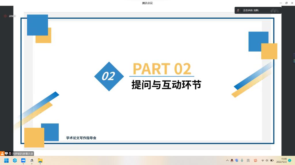 指导会上,杨海丽老师结合以往教学经验和党的二十大精神对当代大学生提出相关要求,进而引出学术论文写作应具备的条件。从阅读论文、选好一个题目、论文提纲设计、论文难点四个方面向同学们进行了写作指导,每个方面都进行细致具体的分析,列举相关案例,解析各个方面的重要性,使同学们对论文写作有了明确思路。同学们结合自身情况,现场提问,杨老师耐心、针对性地回答同学们的问题,并引用优秀学生论文做出相关阐述。最后,喻老师对本次指导会做出总结,对参与的老师、同学表示感谢,对同学们提出殷切期望,并对后续的主题论文比赛做出相关安排和要求。
