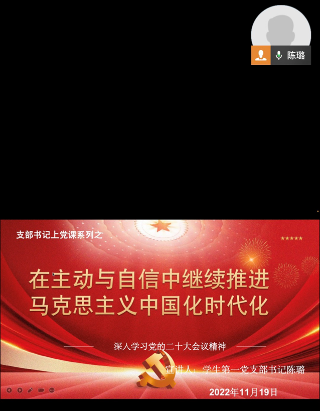 为深入学习领会党的二十大报告中关于“马克思主义中国化时代化”的重要论述,弘扬伟大建党精神,11月19日,yl34511线路中心学生第一党支部在田家炳404会议室以“线上+线下”方式开展支部书记上党课活动,支部全体党员参加。