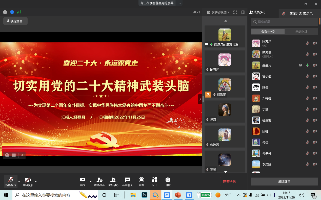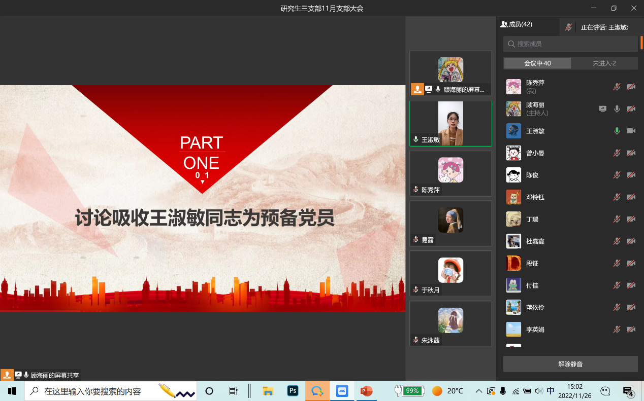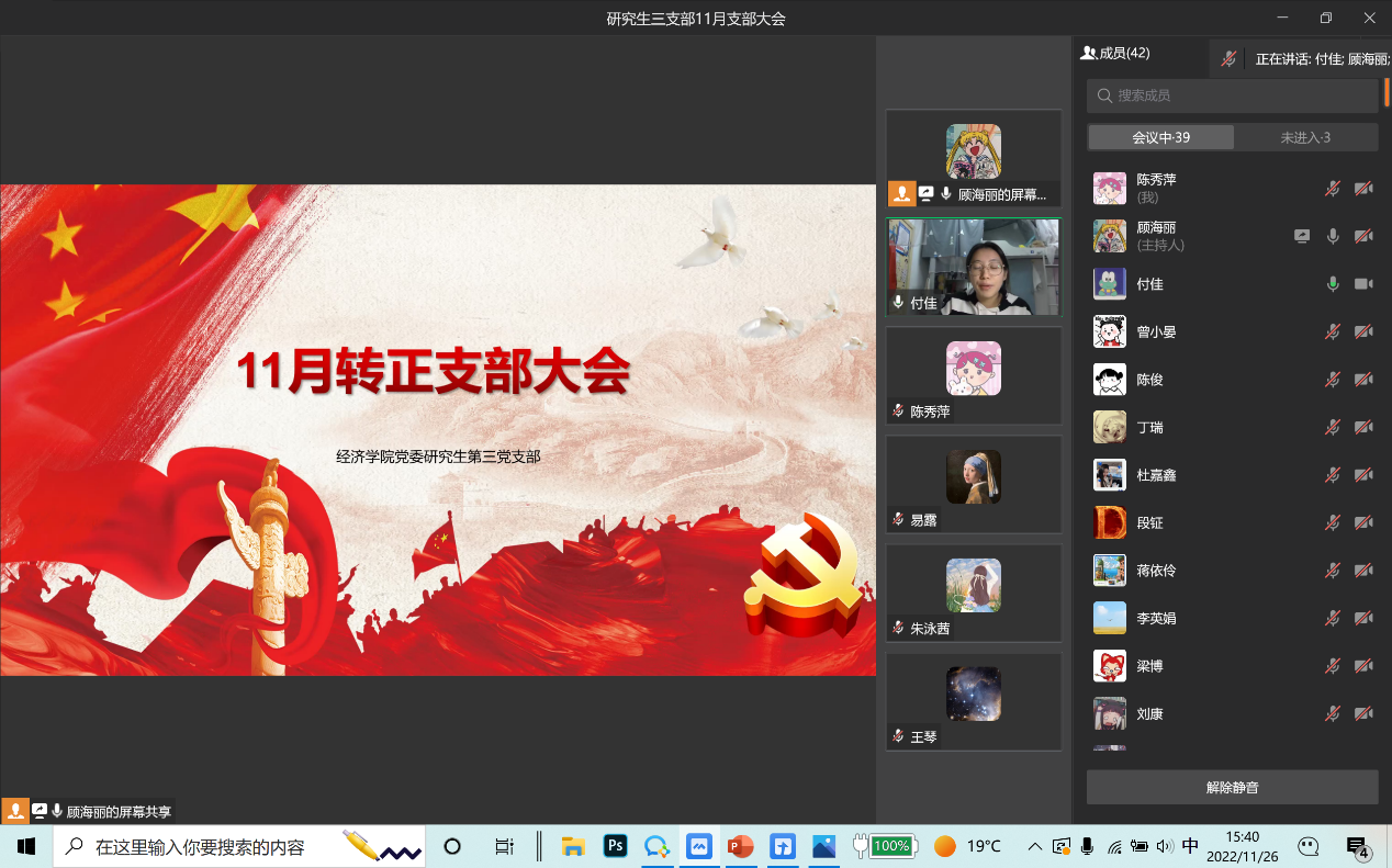 2022年11月26日,yl34511线路中心研究生第三党支部通过企业微信线上会议召开了11月支部大会,会议内容包括支部书记讲党课事宜、预备党员转正以及讨论接收预备党员事宜。本次会议由支部书记薛晶月主持,研究生三支部全体党员参加。