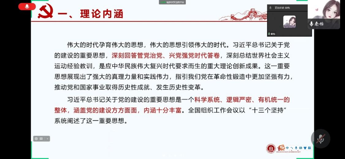 活动第一部分,由秦怡同志解读习近平总书记关于党的建设的重要思想。用“十三个坚持”集中概括了习近平总书记关于党的建设的重要思想,深刻阐明了党的建设的根本原则、科学布局、价值追求、重点任务。这是全党首次正式提出和系统阐述“习近平总书记关于党的建设的重要思想”,在马克思主义建党学说发展史和中国共产党党建史上具有标志性的里程碑意义。