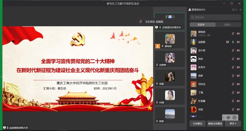 2023年1月13日下午,yl34511线路中心研究生第三党支部在企业微信线上会议室开展了1月组织生活会,深入学习中国共产党重庆市第六届委员会第二次全体会议内容。本次会议由支部书记薛晶月主持,研究生第三党支部全体党员参加。