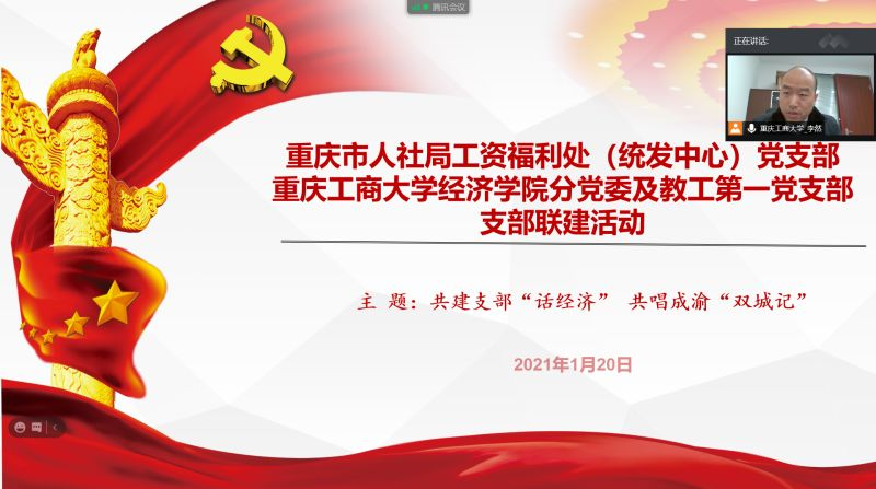2021年1月20日上午,重庆工商大学yl34511线路中心分党委同市人社局工资福利处(统发中心)党支部在腾讯会议上在线开展了主题为“共建支部‘话经济’,共唱成渝‘双城记’”的支部联建活动,市人社局工资福利处程卫民处长、人社局规划财务处谷亚处长、人社局直属机关党办胡剑主任、市机关事业单位工资统发中心宋晓辉主任、yl34511线路中心分党委李自维书记、正处级组织员雷菁委员、市人社局工资福利处(统发中心)党支部和重庆工商大学yl34511线路中心分党委教工第一党支部全体党员近60人参加了会议。