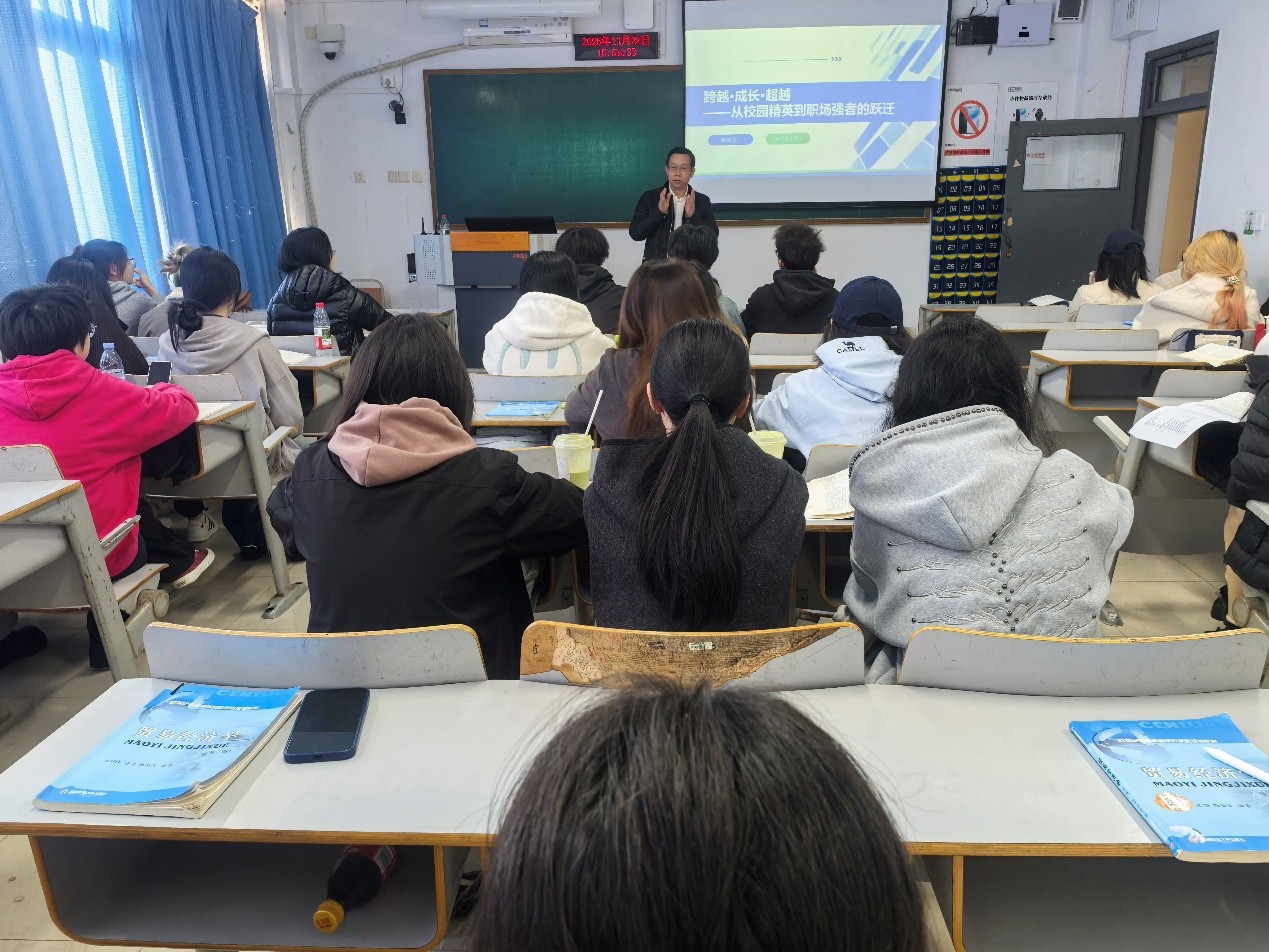 2025年11月28日,重庆商社集团、重庆百货人力资源总经理张泽军受邀到yl34511线路中心,为贸易经济专业的同学们开展了一场专题讲座。他以“跨越·成长·超越——从校园精英到职场强者的跃迁”为主题,带来了浓缩版的职场成长指南,为同学们搭建校园与职场的衔接桥梁、明确职业进阶方向提供了实用的经验参考。