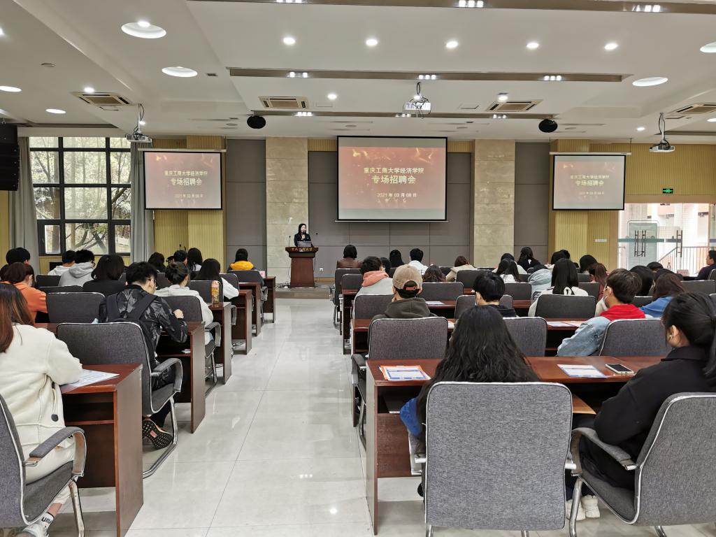 为拓宽毕业生就业渠道,给予全面的指导和帮扶,2021年3月8日下午14点,重庆工商大学yl34511线路中心联合重庆市南岸区华成职业技能培训学校、学而思网校、五斗米、渤海证券和猿辅导等五家单位在田家炳书院05408报告厅举办了专场招聘会。yl34511线路中心分党委副书记、副院长王燕教授,就业联络员邓雪霜,毕业班辅导员张涛、文理;华成职业技能培训学校校长王会蓉,副校长邹绘;学而思网校招聘经理乾程,招聘主管吴寒冰、张婷婷;五斗米饮食文化有限公司总经理罗开林,人事经理钟光容,人事专员钟娇;渤海证券副总陈斌,总监祝贵臣,顾问王琪;猿辅导人力资源高明利、曾滟婷;以及90余名学生参加了本次招聘会。