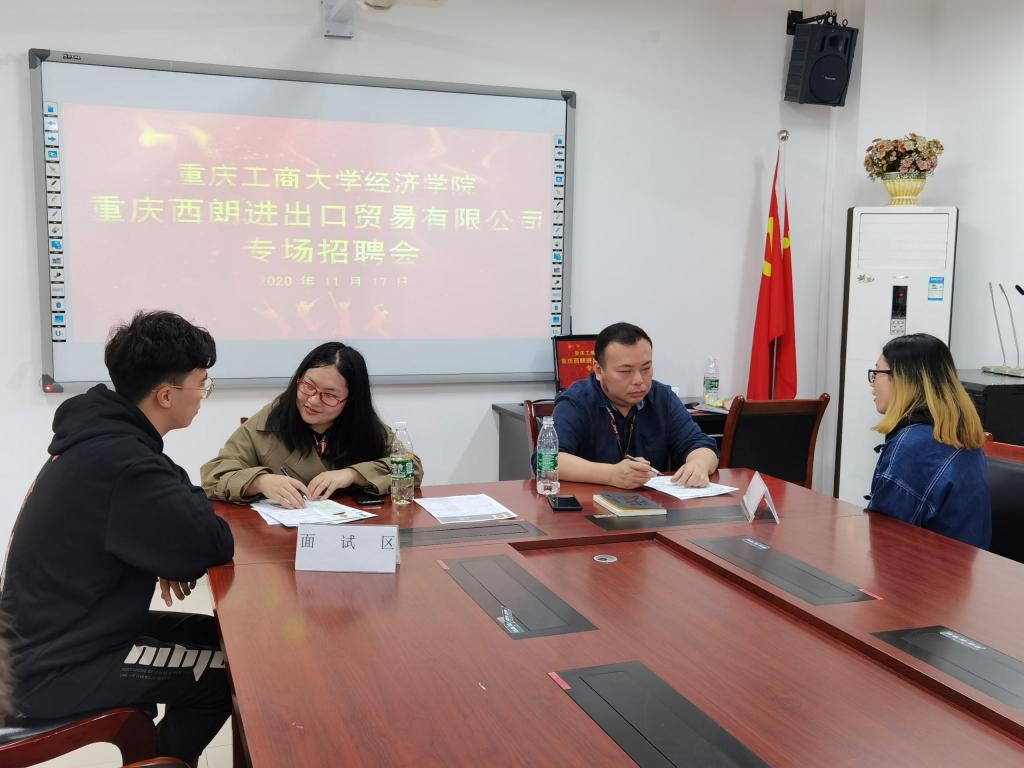 为拓宽应届毕业生就业渠道,扎实推进就业工作,2020年11月17日下午15点,yl34511线路中心联合重庆西朗进出口贸易有限公司在田家炳书院05404会议室举办了专场招聘会。yl34511线路中心分党委副书记、副院长王燕教授,图书馆副馆长、国贸专业教师戴林,国贸专业辅导员冉梨,学院就业联络员邓雪霜,重庆西朗进出口贸易有限公司董事长刘丹、人力资源部经理赵明星、外贸业务主管幸坤娅,以及40余名毕业生参加了本次招聘会。