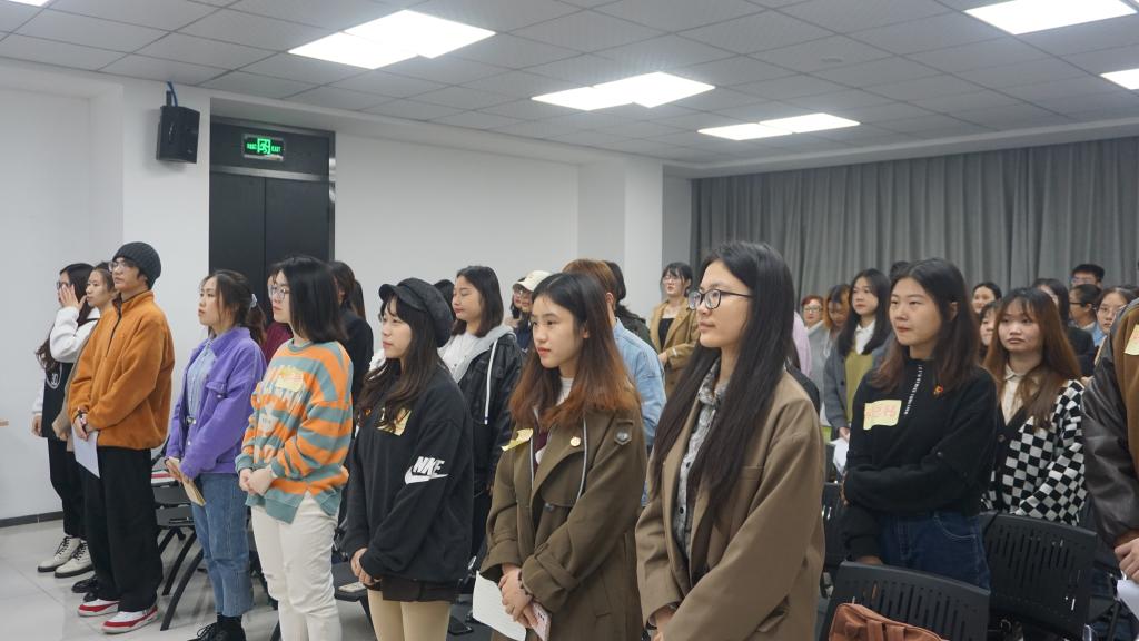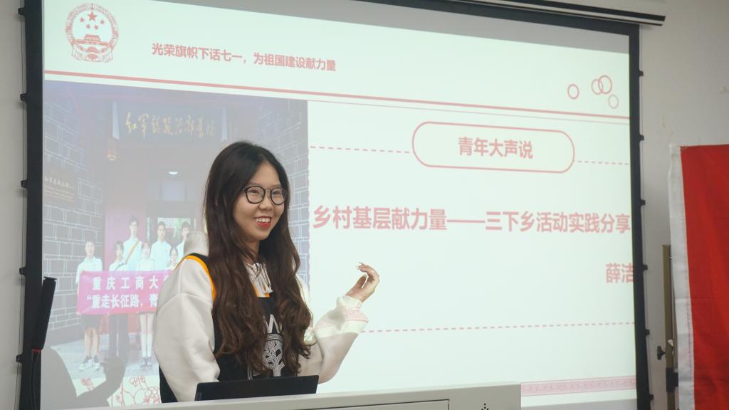 最后,团支部内优秀的青年团员进行了暑期专业实习以及三下乡活动的分享。薛洁同学分享了三暑期时跟随学校三下乡实践团队,深入红色圣地遵义的乡村基层,走访调查,理论宣讲,服务社会的经历,得到了当地群众及社会的认可;梁颜和杜欣蔚同学则是讲述了暑期参与重庆西朗进出口贸易公司举办的“Z世代VINI商业旅行家夏令营”的宝贵实习经历,激励大家不能局限眼界,更多的走出校园,亲身去实践探索属于自己的天地。每位青年还写下了自己对于祖国的寄语和对自己未来的期许,留下了作为新世代的承诺。