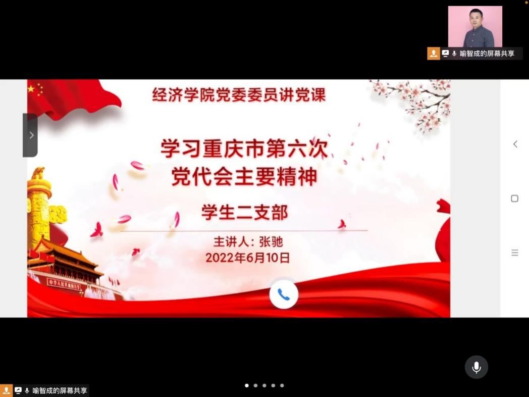 2022年6月10日,yl34511线路中心学生第二党支部线上开展“学习重庆市第六次党代会精神”主题党课活动。本次活动邀请到yl官网党委委员——张驰博士为全体支部党员领学,会议由支部书记喻智成老师主持,全体党员参加。