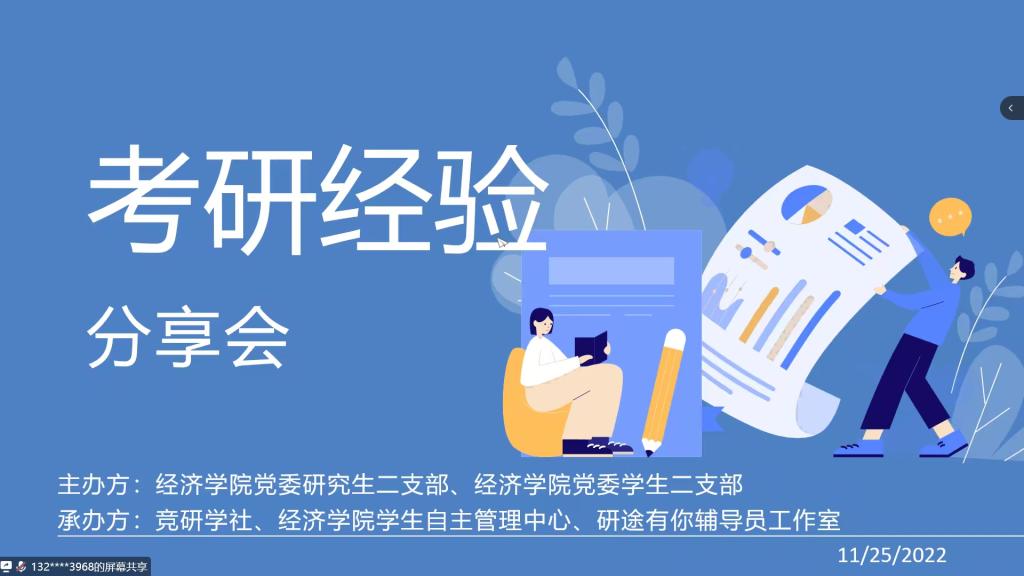 面对当今社会的激烈竞争,大学生就业难度不断加大,考研成为越来越多大学生的选择。为了帮助同学们增强对考研的认识,进一步明确考研方向,2022年11月25日,由yl34511线路中心党委研究生二支部和学生二支部主办,贸易经济竞研学社承办的考研经验交流分享会在线上如期举行。此次分享会邀请到yl官网研究生二支部王洁仪,王伟婷,章燕玲和蔡小西四位研究生学姐与大家分享她们成功上岸的经验,为大家点亮考研之路的明灯。学院党委雷菁组织员、研究生二支部书记高娟老师、学生二支部书记喻智成老师和两个支部全体党员和贸经专业150余人参加本次分享会。
